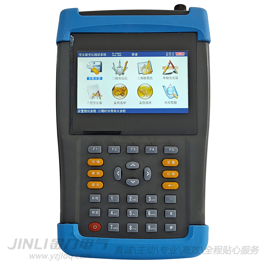 JL3010S手持式变比测试仪(手持式普通款)内置大容量锂离子充电电池,无需外接电源即可进行测试,现场方便易用。仪器采用大屏幕真彩色液晶做为显示器,全中文图形化操作界面并配有汉字提示信息、多参量显示的液晶显示界面,人机对话界面友好,向量图显示及接线判断为检查电路的正确性提供了可靠的依据。全触摸式导电硅胶键盘操作方式,操作手感好,简便易用。