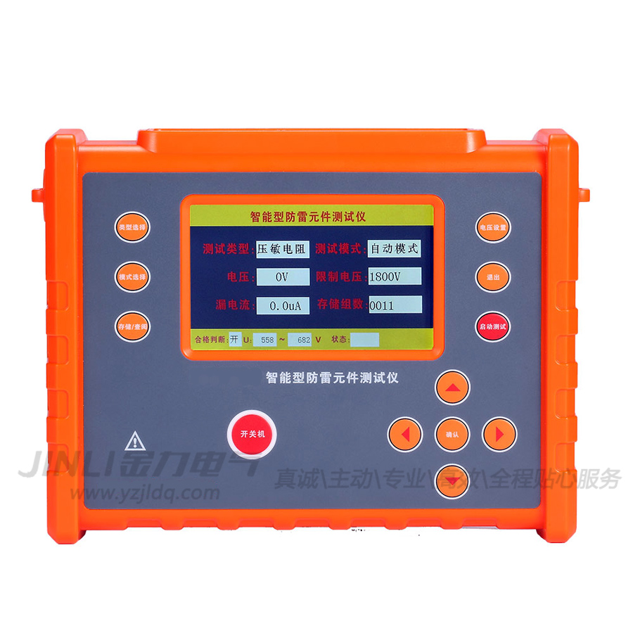 JL8007智能型防雷元件测试仪由中大规模集成电路组成。本表输出功率大,起始动作电压测量范围:0-2000V,漏电流测量范围:0.1~199.9uA,绝缘电阻:0~1000MΩ,重复稳定性好,一键测量方便快捷。